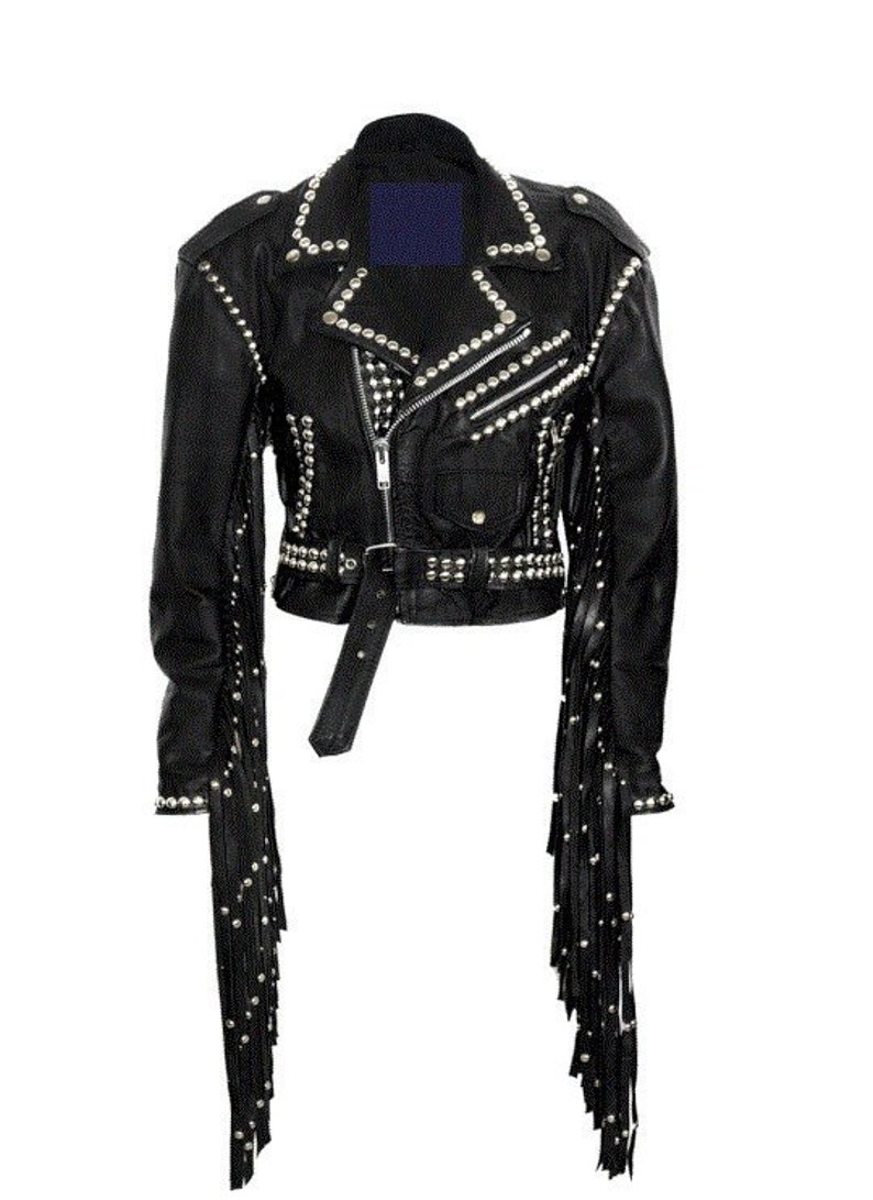 Customize Black Brando Jacket, Silver Studs Bikers Pure Leather Jacket, Long Fringes Motorbike Jacket, Waist Belt, Lapel Collar Fashion Jacket,