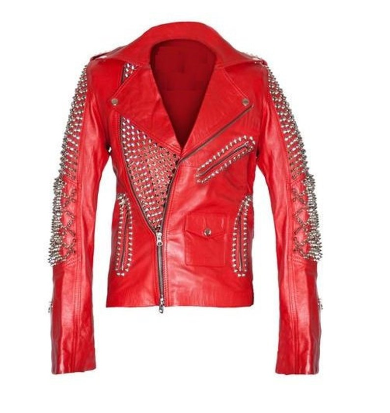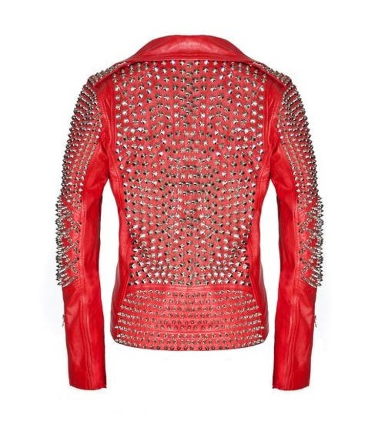 Ladies Silver Studded Jacket, Red Punk Silver Long Spiked, Red Cow Skin Leather Bikers Jacket, Zippered Pockets Jacket, Customize Fashion Jacket,