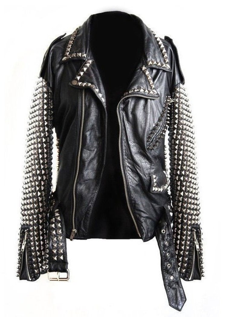 Made To Order Bikers Silver Studded Leather Jacket, Pyramid Studs On Sleeves Brando Black Color, Waist Belted Star Shape Studs Jacket,