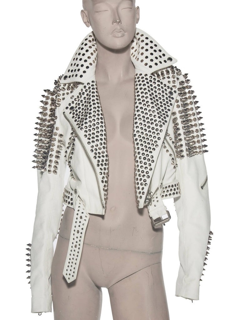 Customize Ladies Silver Long Studded Jacket, Premium Cowhide Leather Jacket, Spiked Studs Placed By Hand. Waist Belted Bikers Fashion Jacket,