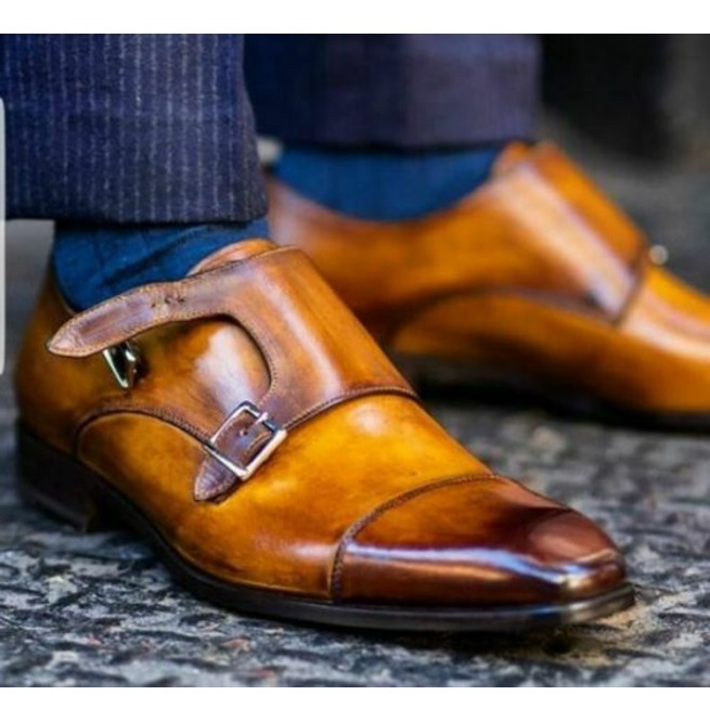 Tan Brown Double Buckle Strap, Monk Pure Leather, Cap Toe Formal Wedding Shoes,