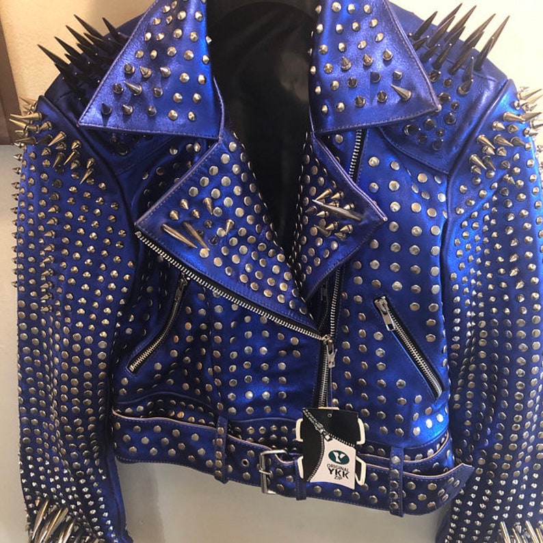 Customize Blue Color Studs Jacket, Silver Long Spiked Studs, Bikes Waist Belted, Personalized Steam Punk Jacket, Ladies Leather Fashion Jacket,