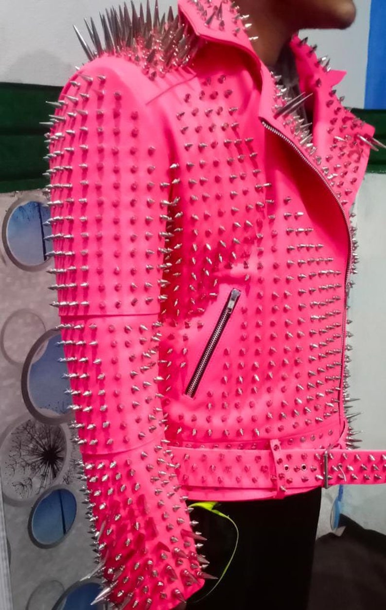 Steam Punk Waist Belted Punk Jacket, Bikers Silver Studs, Men's Fashion Gothic Jacket, Personalized Handmade Lapel Collar Pink Jacket,