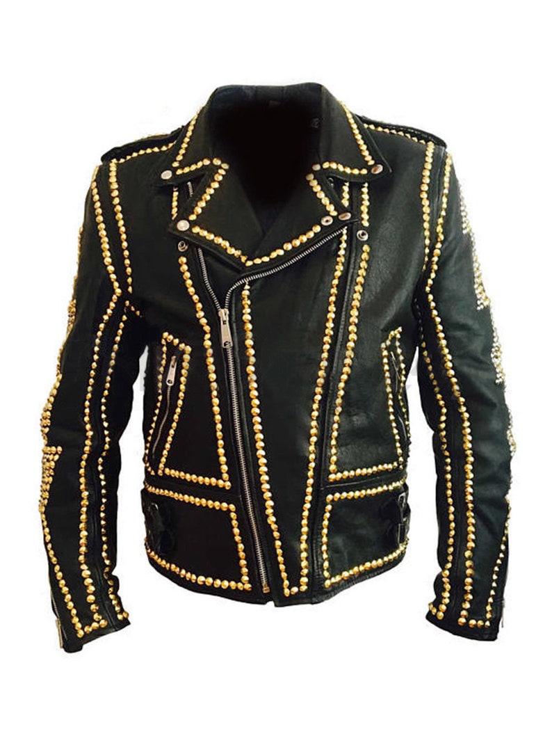 Made To Hand Golden Studded Bikers Jacket, Premium Leather Fashion Punk Jacket, Men's Brando Lapel Collar Leather Studs Jacket,