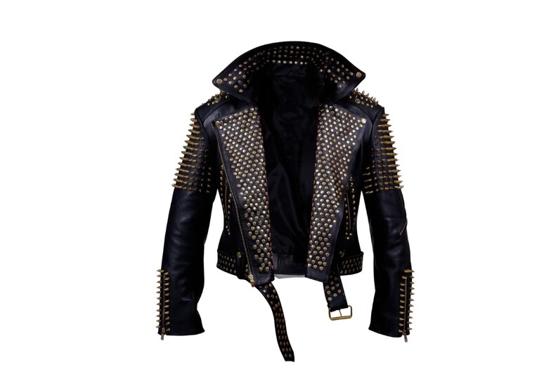 Men's Golden Studs Jacket, Personalized Waist Belted Punk Jacket, Lapel Collar, Pure Leather Spiked Fashion Jacket, Motorbike Jacket,