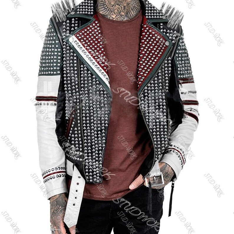 Customize Multicolor Long Spiked, Premium Leather Waist Belt, Bikers Lapel Collar Steampunk, Men's Handmade Silver Studs Fashion Jacket,