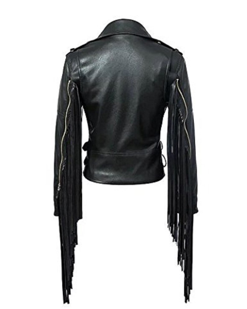 Black Color Bikers Long Fringes Handmade Jacket, Cow Skin Leather Double Waist Belted, Women's Fashion Brando Punk Jacket,
