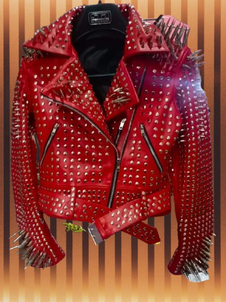Personalized Bikers Long Spiked Handmade Red Premium Leather Jacket, Steam Punk Waist Belted Brando, Men's Motorcycle Fashion Jacket,