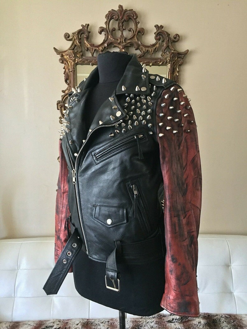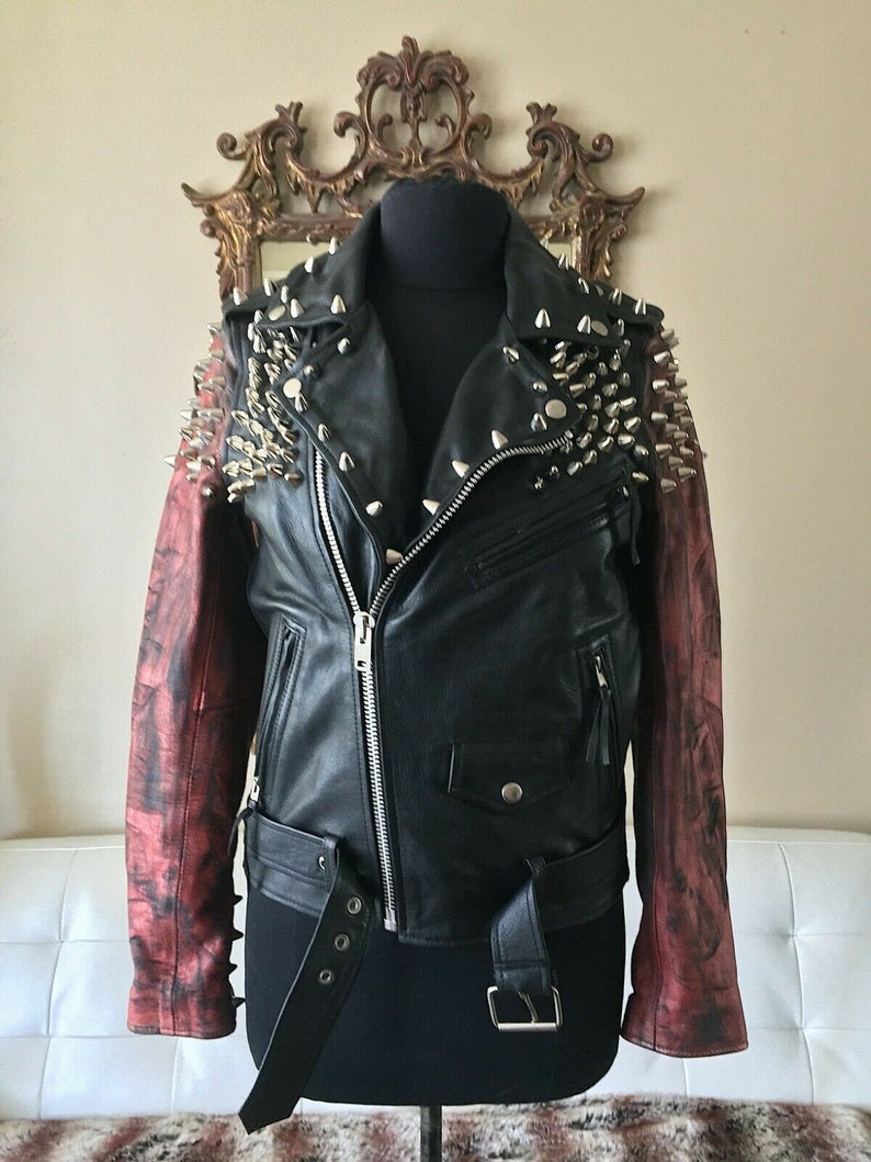 Silver Conical Studs Genuine Leather Dual Color, Men's Handmade Bikers Waist Belted, Brando Studded Fashion Punk Jacket,