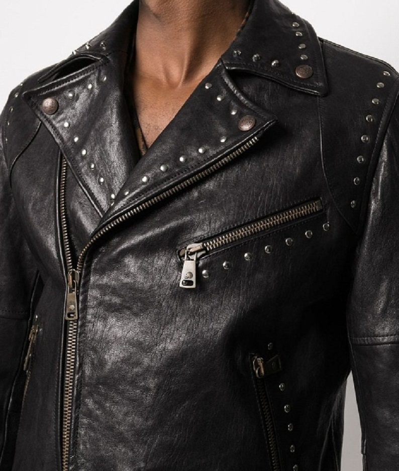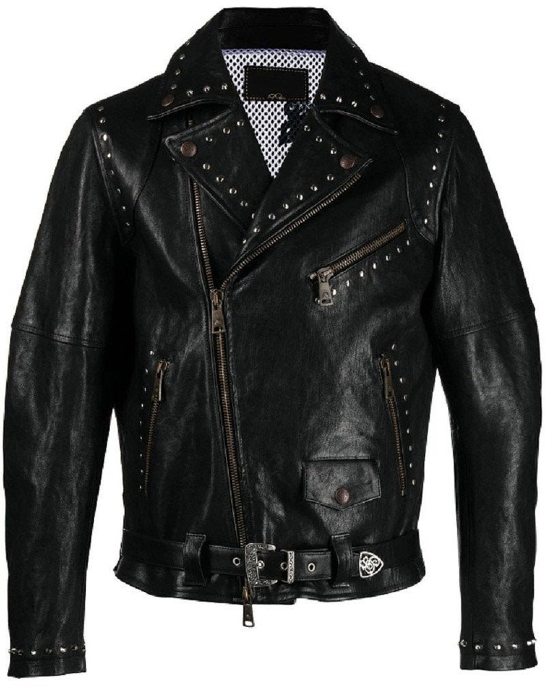 Men's Personalized Brando Style Jacket, Black Cowhide Leather Waist Belted, Customize Zippered Punk Fashion Silver Studded Bikers Jacket,
