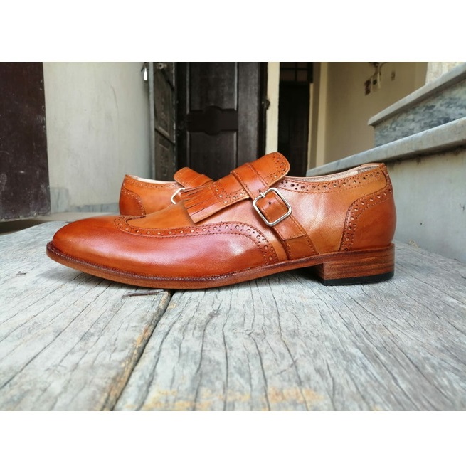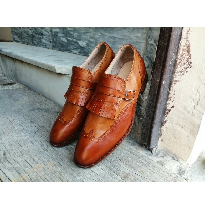 Shining Fringes Monk Buckle Strap Genuine Leather Wingtip Handmade Dress Shoes