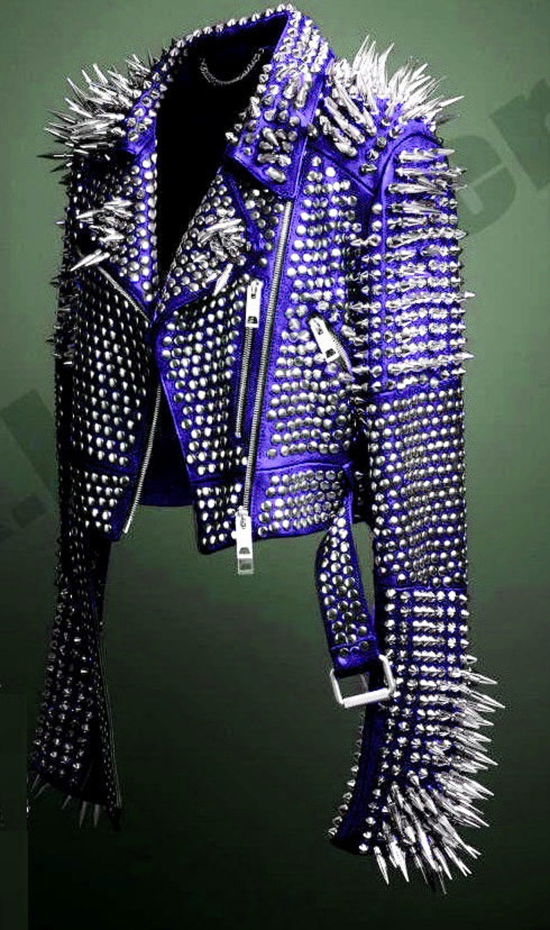 Handmade Purple Color Cowhide Leather Fashion Jacket, Heavy Metal Long Spiked Studs, Waist Belted, Side Zippered Punk Jacket, Bikers Jacket,