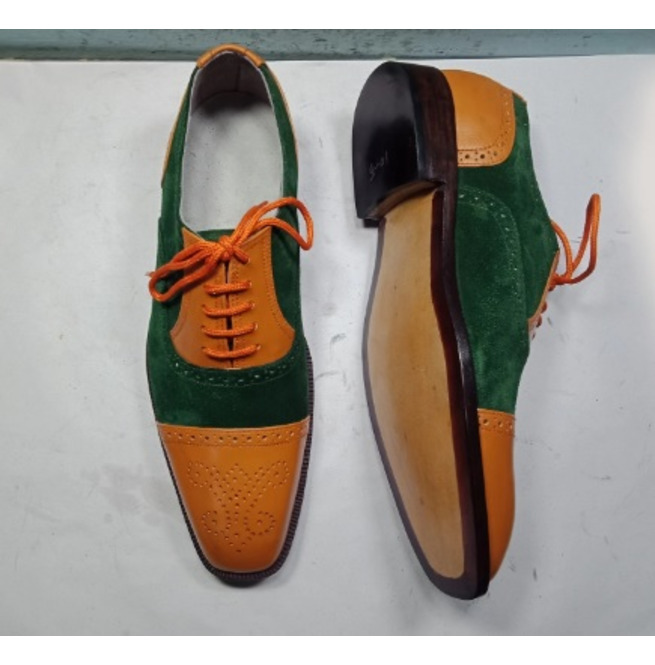 Handmade Green Suede Leather Lace Up Formal Orange Patina Semi Brogue Shoes