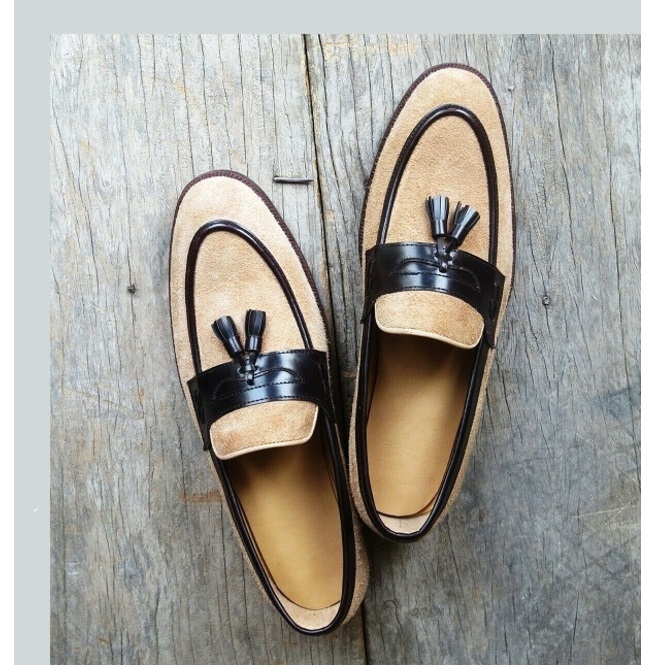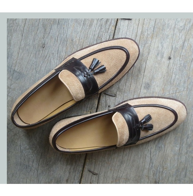 Tassels Loafer Suede Leather Apron Toe Men's Hand Stitched Pull On Wedding Shoes