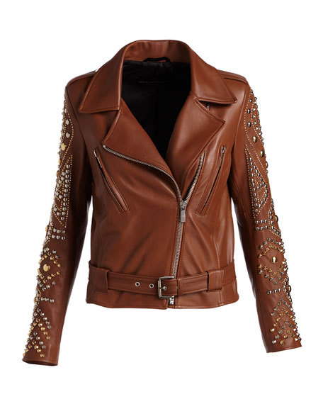 Brown Color Lapel Collar Motorcycle Studded Jacket, Women's Real Leather Studded Sleeves, Customize Waist Belted And Shoulder Epaulets Jacket,