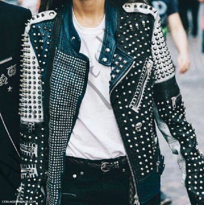 Two Tone Bikers Multi Studs Personalized Jacket, Women's Hand Made Silver Studs Motor Bike Jacket, Button Collar And Zippered Pockets Fashion Jacket,