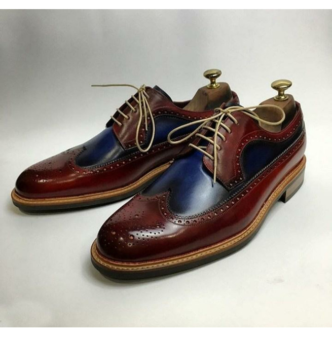 Derby Longwing Two Tone Wingtip Medallion Pure Leather Lace Up Formal Shoes