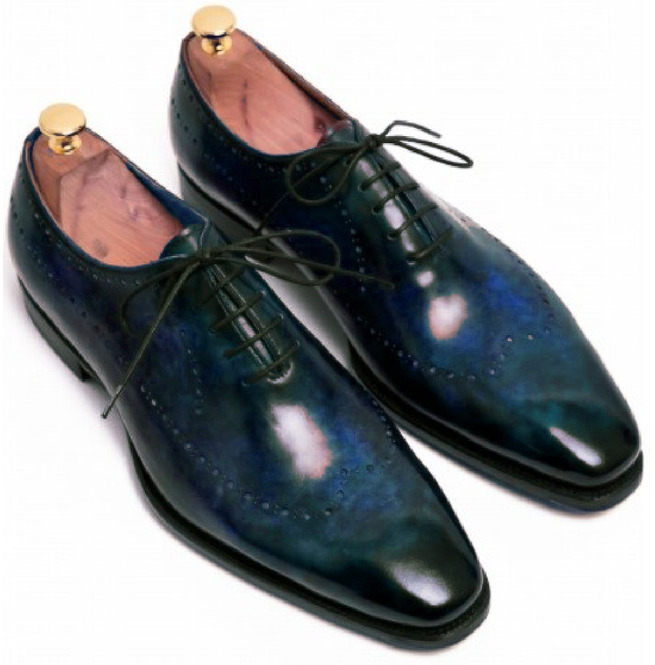 Handcrafted Patina Blue Medallion Wingtip Pure Leather Men's Oxford Shoes