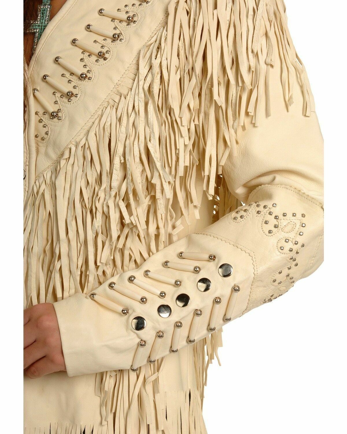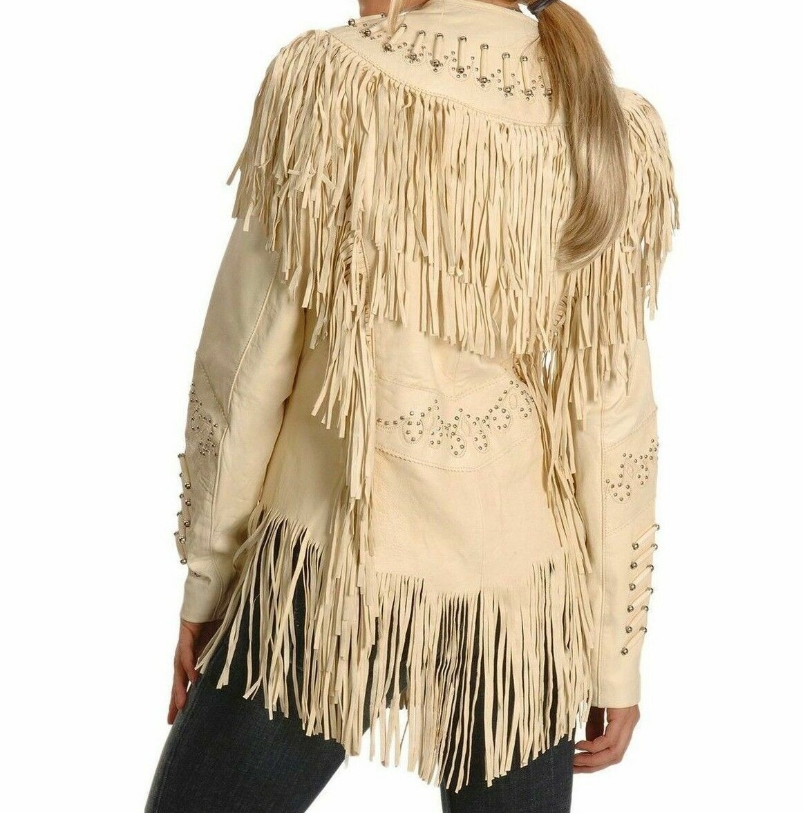Personalized Women's Off White Buck Skin Buffalo Suede Leather Bones And Beads Coat Jacket, Hand Made Button Up Fringes Western Coat Jacket,