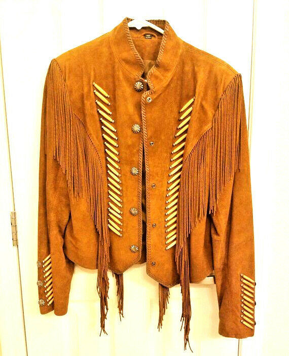 Men's Tawny Suede Leather Bones And Beads Buck Skin Buffalo Coat Jacket, Hand Made Button Up Fastening, Western Fringes Pow Wow War Shirt,