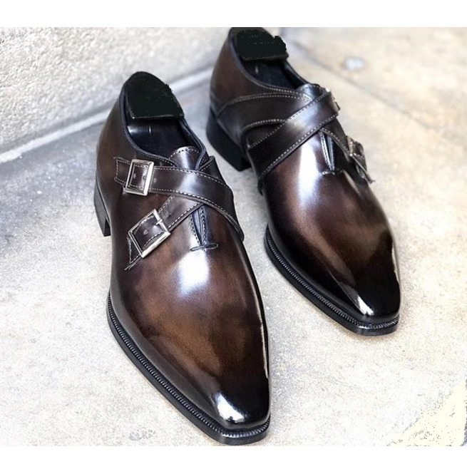 Hand Made Monk Cross Strap Cowhide Leather Patent Coffee Brown Men Formal Shoes