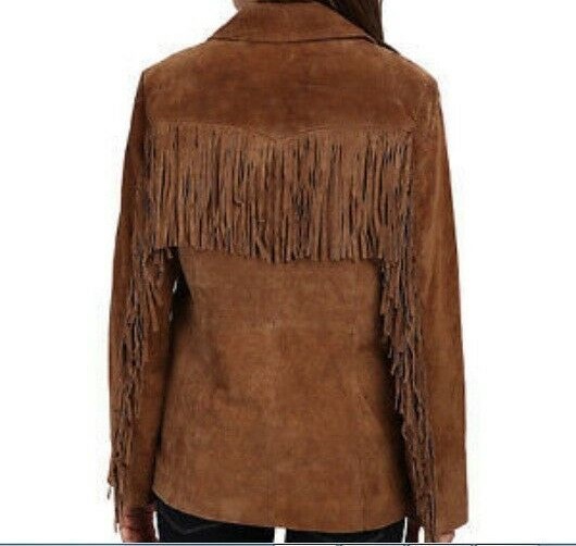 Ladies Cow Girl Brown Buck Skin Buffalo Suede Leather Fringes Hand Made Button Up Coat Jacket