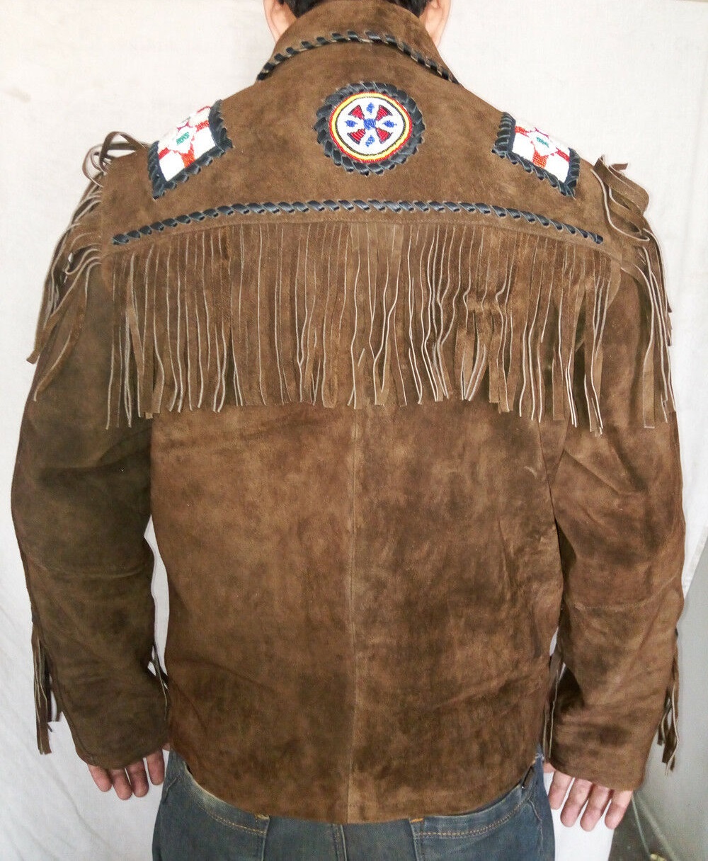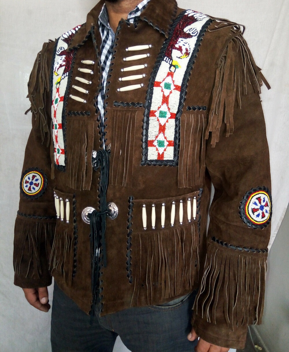 Eagle Patches Bones And Beads Western Men's Jacket, Brown Buck Skin Buffalo Drawstring Cow Boy Jacket, Personalized Fringes Coat Jacket,