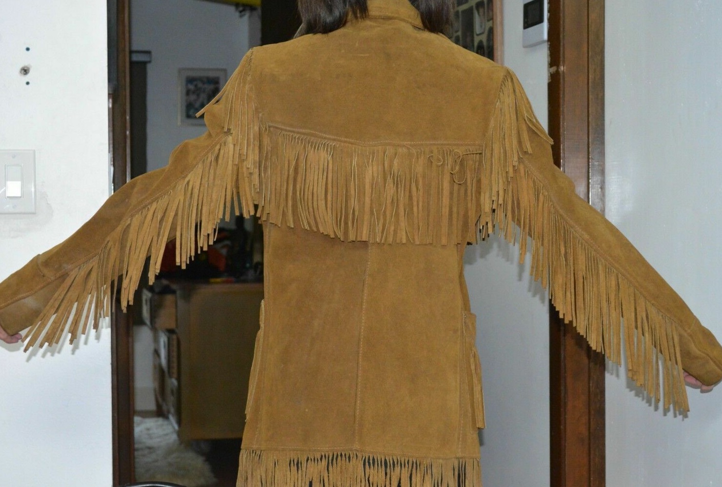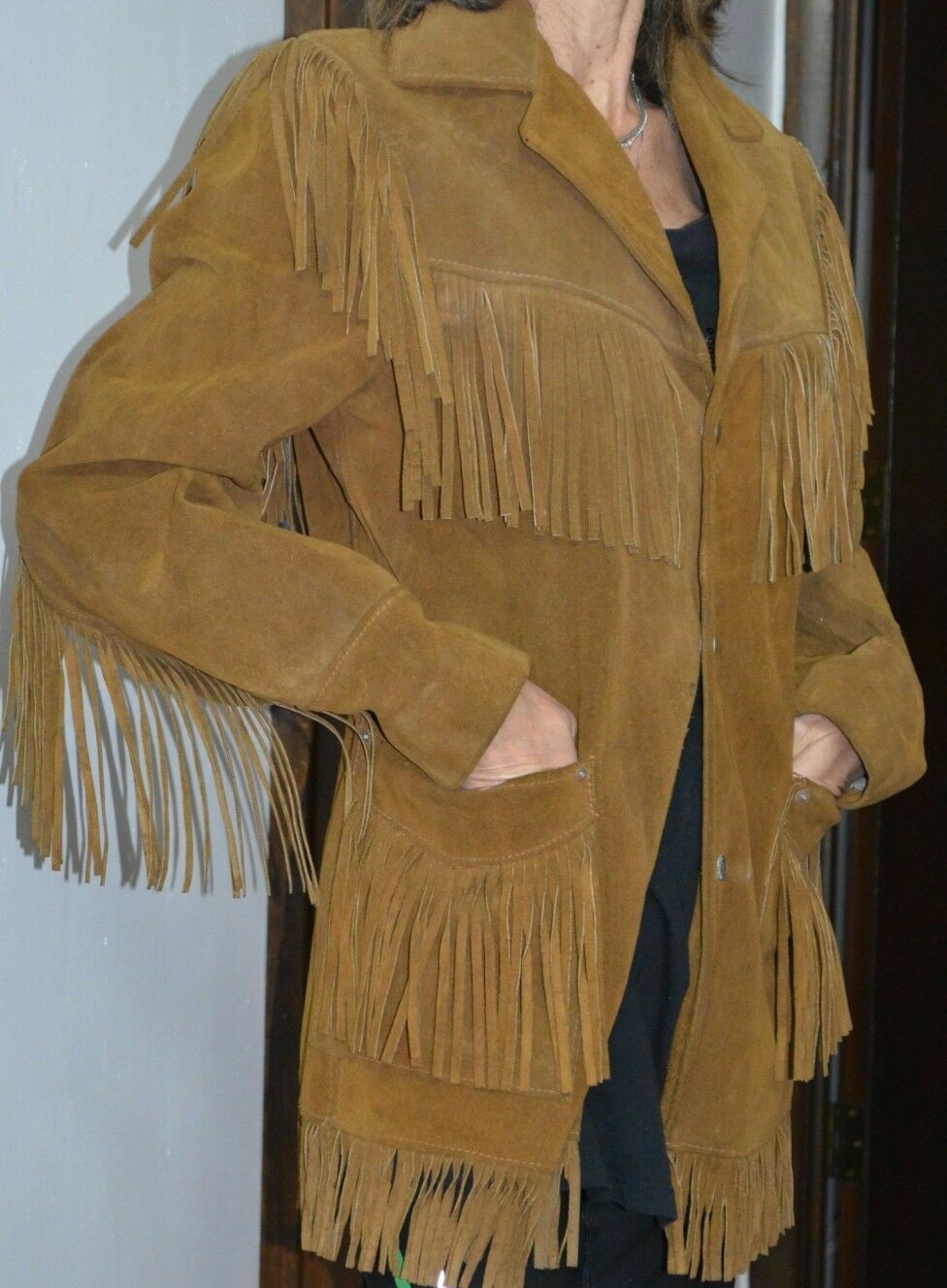 Hand Made Brown Cow Hide Suede Leather Personalized Women's Western Style Fringes Coat Jacket