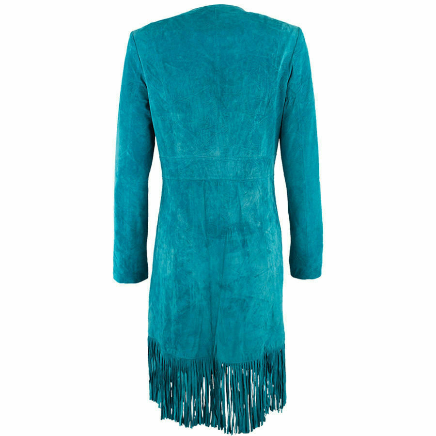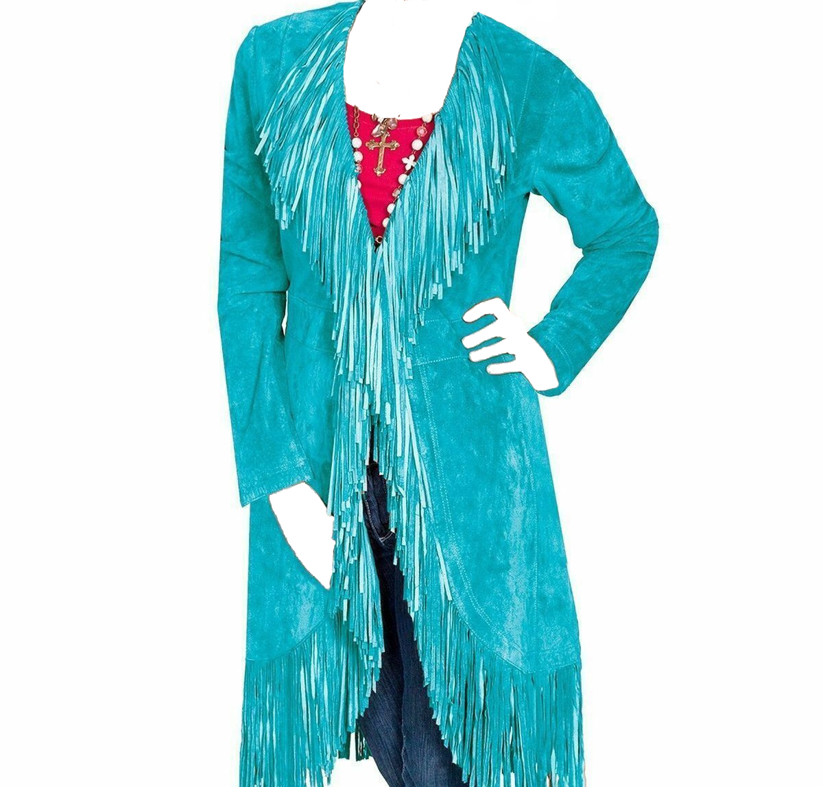 Western Blue Color Long Fringes Cow Girl Buck Skin Buffalo Suede Leather Women's Pow Wow Coat