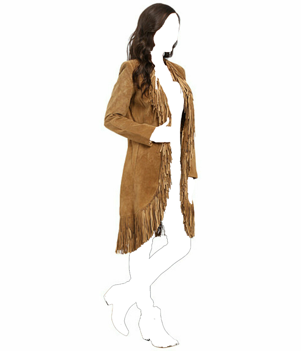 Women's Cow Girl Brown Color Long Fringes Buck Skin Buffalo Suede Leather Western Pow Wow Long Coat