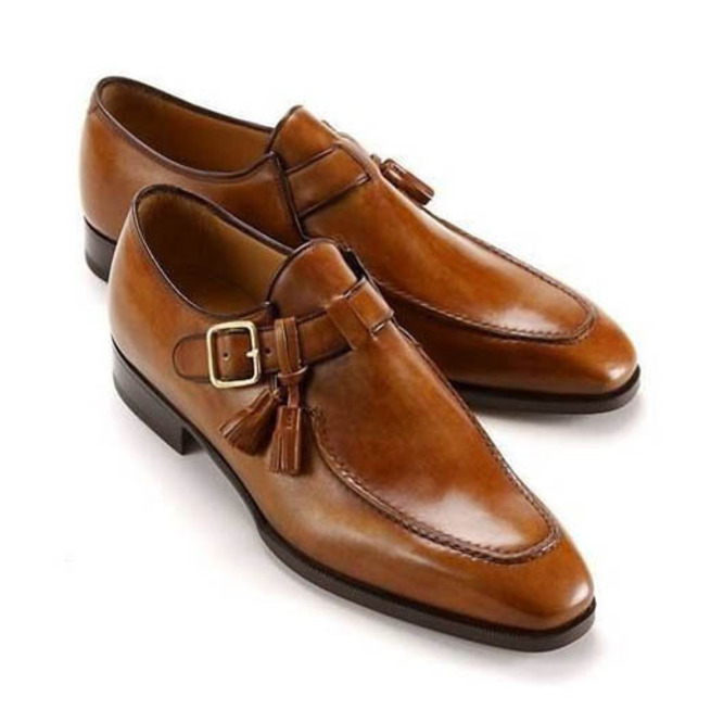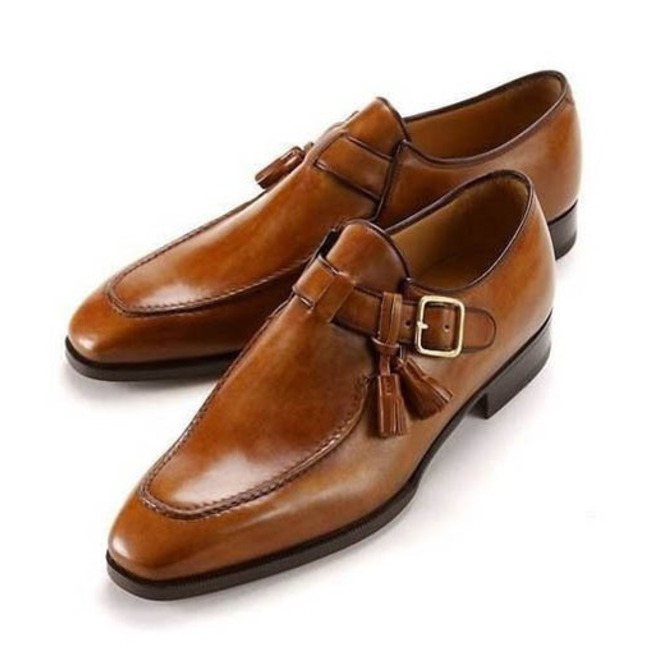 Unique Tassel Monk Strap Genuine Leather Men Handcrafted Apron Toe Formal Shoes