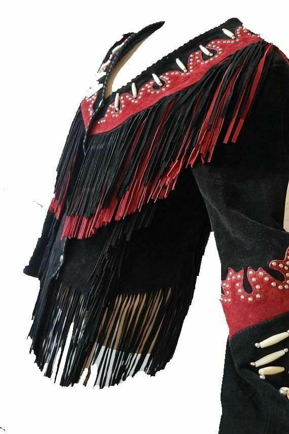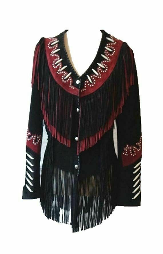 Women's Cow Girl Fringes Fashion Coat, Dual Color Bones And Beads Long Fringed Buck Skin Buffalo Suede Leather, Handmade Western Coat Jacket,