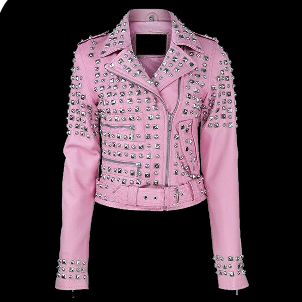 Personalized Pink Pyramid Studs Bikers Jacket, Waist Belted Brando Genuine Leather Fashion Jacket, Women's Motor Bike Punk Jacket,
