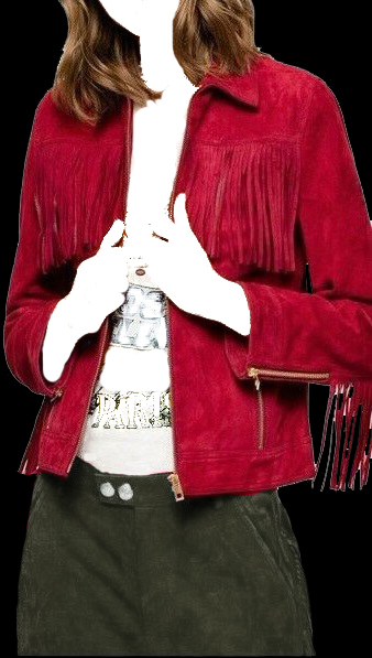 Handmade Red Color Slim Style Real Cowhide Suede Leather Front Zippered Classic Collar Fringes Fashion Jacket, Western Suede Leather Jacket,