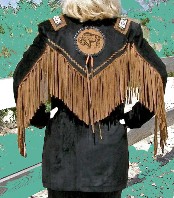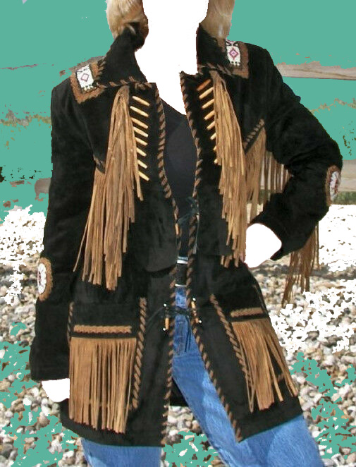 Comfortable Drawstring Closure Black Buck Skin Buffalo Cow Girl Jacket, Handmade Women's Bones And Beads Jacket, Brown Fringes Western Jacket,