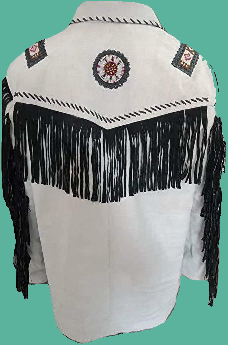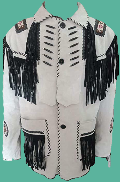White Color Cow Boy Buck Skin Buffalo Suede Leather Bones And Beads Long Fringes Men's Western Style Jacket