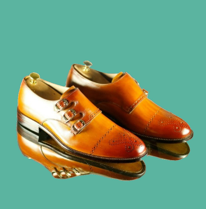Gorgeous Triple Buckle Strap Tan Premium Leather Monk Cap Tor Brogue Dress Shoes